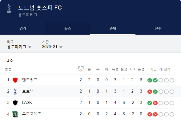 2020-21시즌 토트넘 경기일정 (11월 2일 기준)